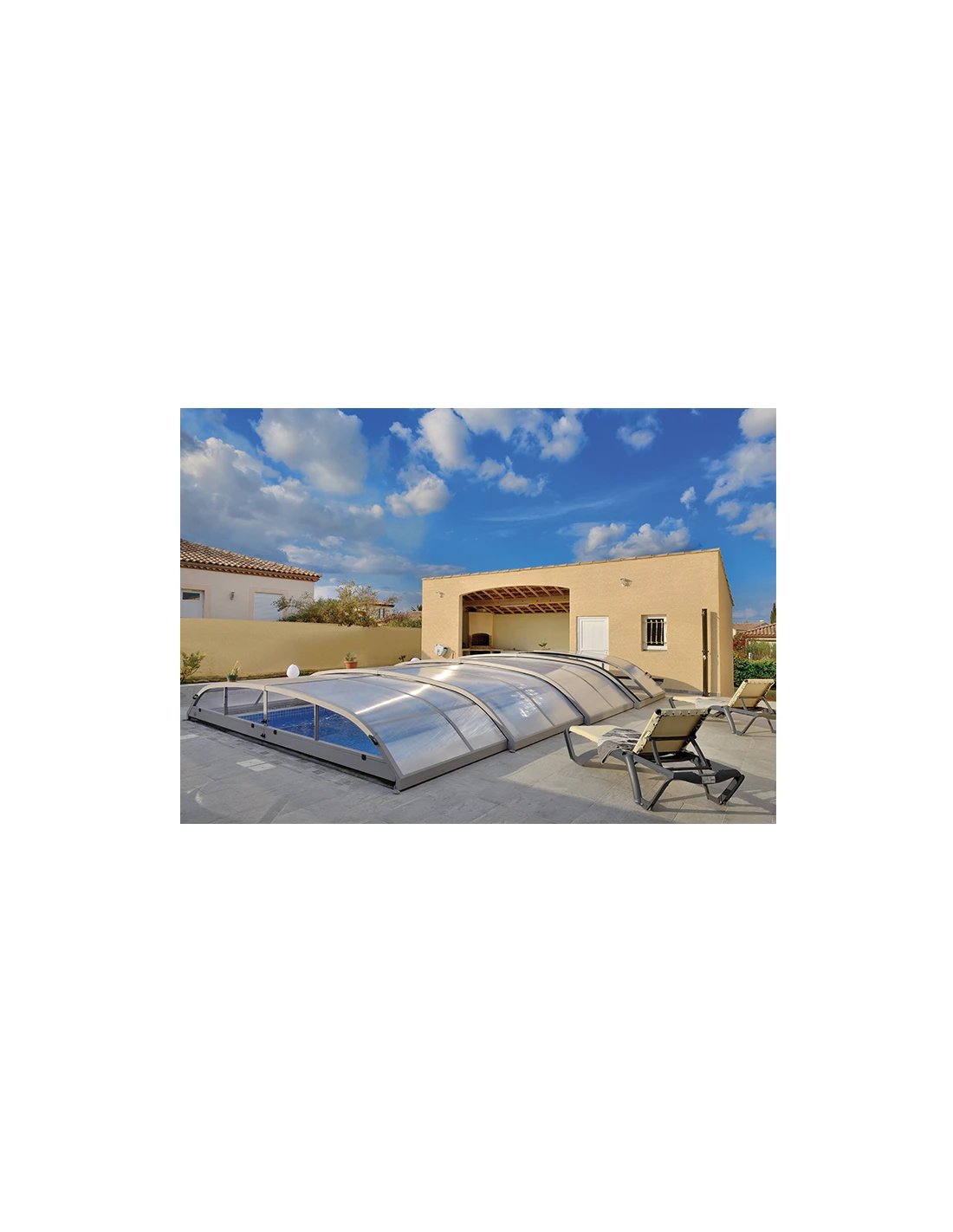 La structure de ces abris de piscine est en aluminium thermo-laqué, la toiture en polycarbonate et les parties transparentes sont traitées anti-UV.