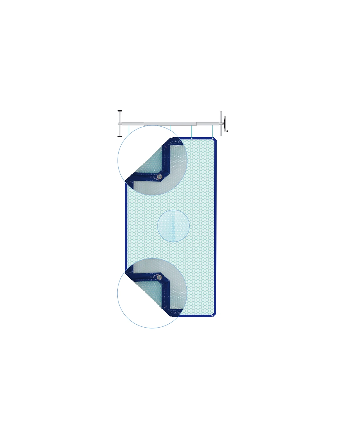 Les couvertures à bulles Géobubble 4 cotés sont constituées de deux faces : la face extérieure translucide est traitée contre les UV et permet d’emmagasiner de précieux degrés pendant la journée tout en jouant un rôle d’isolant pendant la nuit, tandis que la face intérieure bleu nuit et opaque empêche la lumière de pénétrer l’eau et la photosynthèse favorable aux développements des algues.