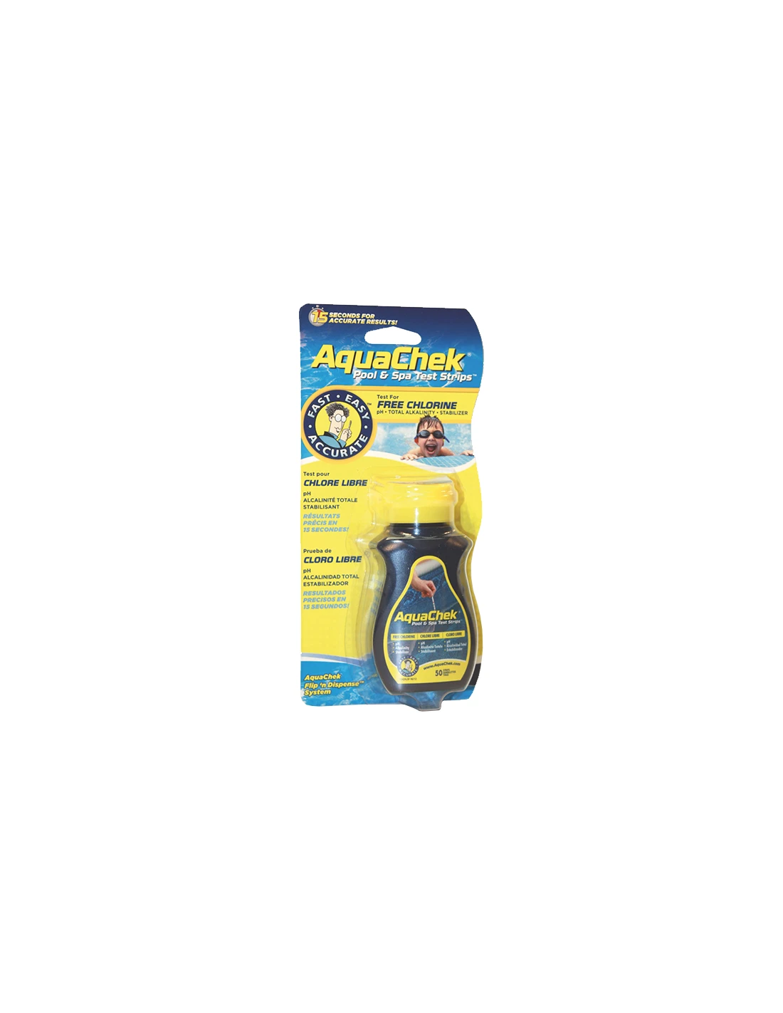 C’est un test de l’eau 4 en 1 qui est proposé avec chacune des bandelettes jaunes Aquacheck. Elles permettent en un instant de contrôler à la fois le taux de chlore, le pH, l’acide cyanurique (stabilisant) et l’alcanité totale (TAC) de votre eau.