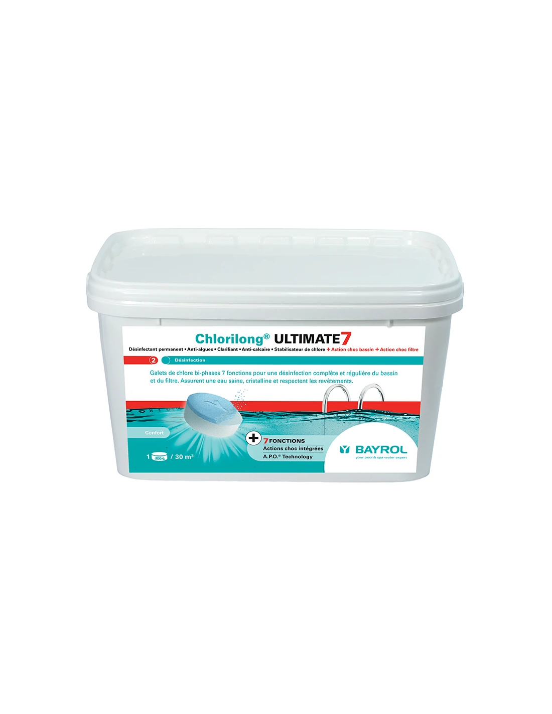 Le Chlorilong Ultimate 7 est utilisé dans le traitement de la piscine.