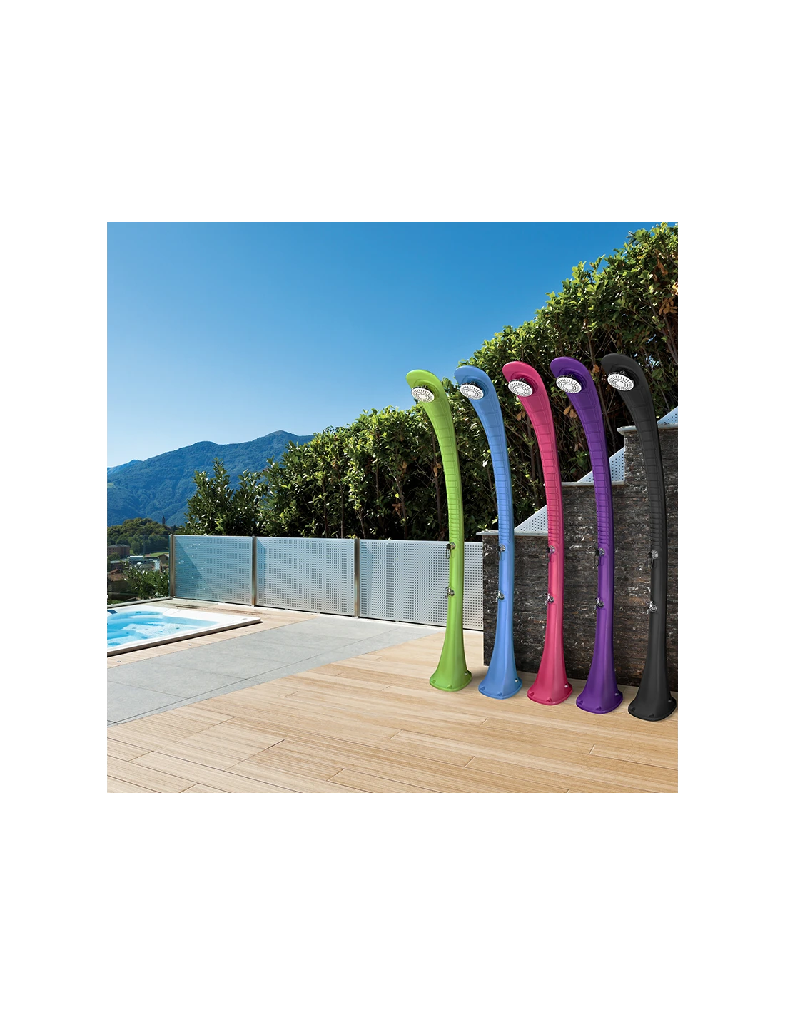 Disponible en cinq coloris différents, la douche solaire se dresse telle une œuvre d’art dans votre jardin. Son allure, rappelant les courbes d’un serpent, s’intégrera parfaitement dans le paysage.