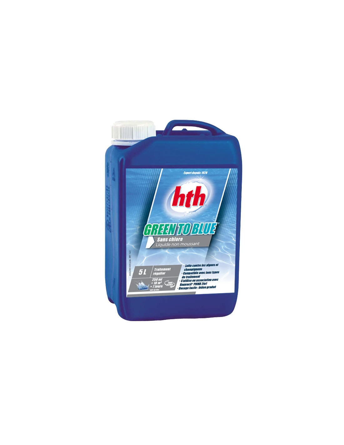 Au nombre des produits désinfectant sans chlore servant en traitement d’eau, il y a Green to Blue HTH. Ce désinfectant à base de péroxyde (oxygène actif ultra concentré) est très efficace contre les algues et vous permet de retrouver une eau claire très rapidement.