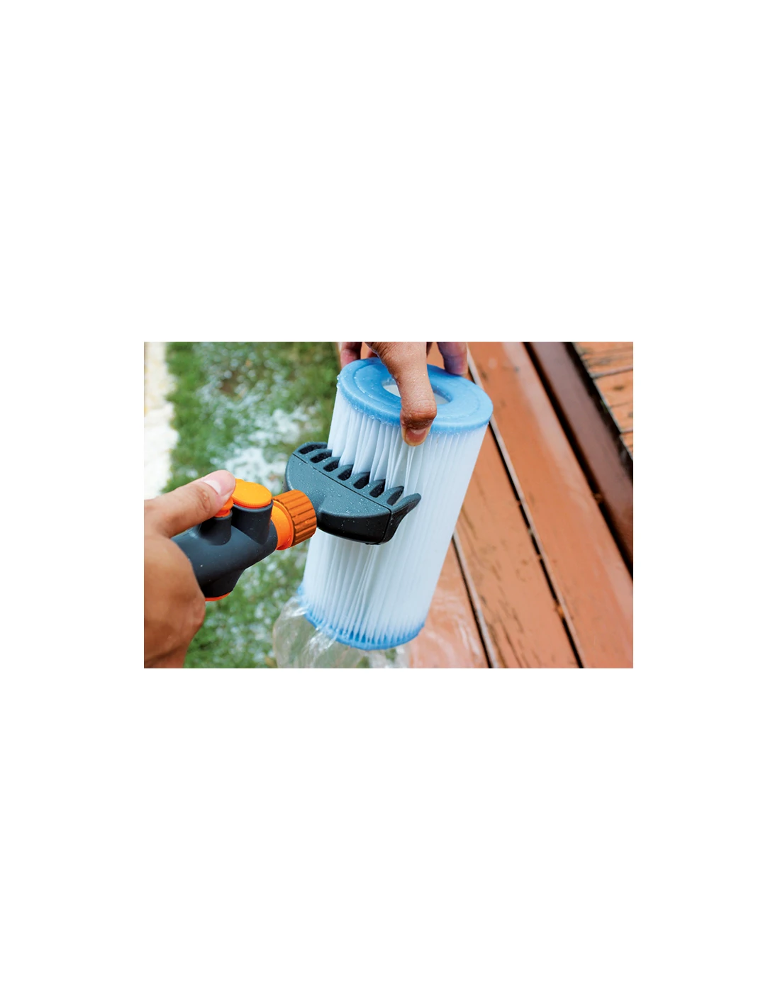 Le peigne se raccorde facilement à un tuyau d’arrosage et s’utilise régulièrement pour l’entretien de votre équipement. Une cartouche nettoyée et bien entretenue durera plus longtemps et sera plus efficace !