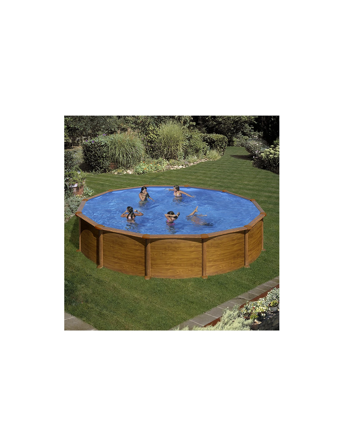 Nous proposons trois dimensions pour cette piscine hors sol Mauritius ronde imitation bois :