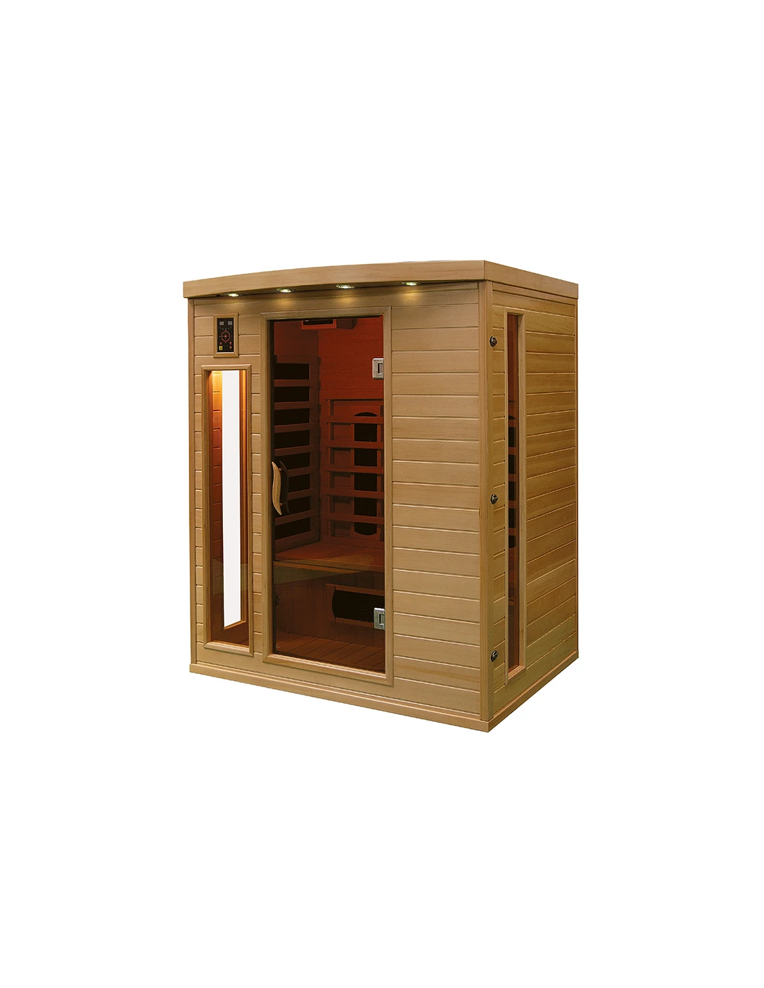 La porte vitrée est en verre trempé, tandis que les bancs et couchettes sont réalisés en sapin. Les diffuseurs d’infra-rouge sont, quant à eux, aspect fibre de carbone. Cette cabine existe en 3 dimensions : 2 places (120 x 120 x 190 cm), 3 places (153 x 125 x 190 cm), 3-4 places (150 x 60 x 150 x 190 cm).