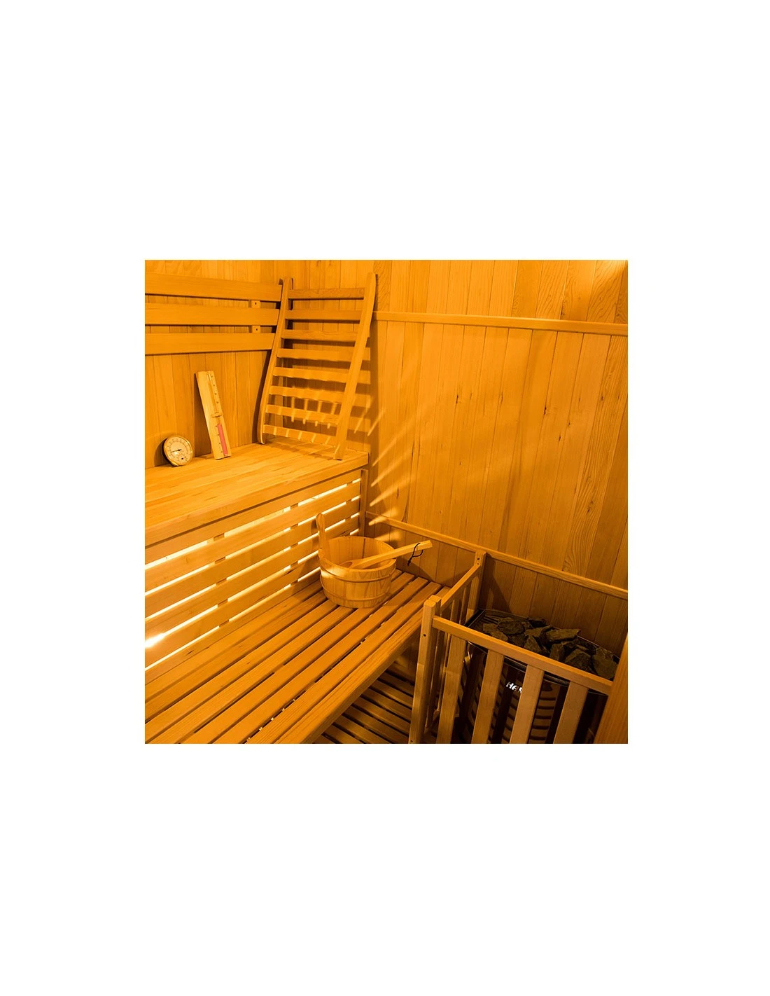 Différents accessoires sont fournis pour une réelle expérience et dans la plus pure tradition : l’indispensable seau en bois et sa louche pour arroser les pierres de lave, la barrière en bois assortie pour parer le poêle, un thermomètre, un hygromètre précis et un sablier mural.