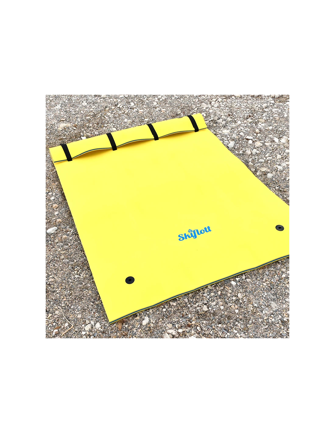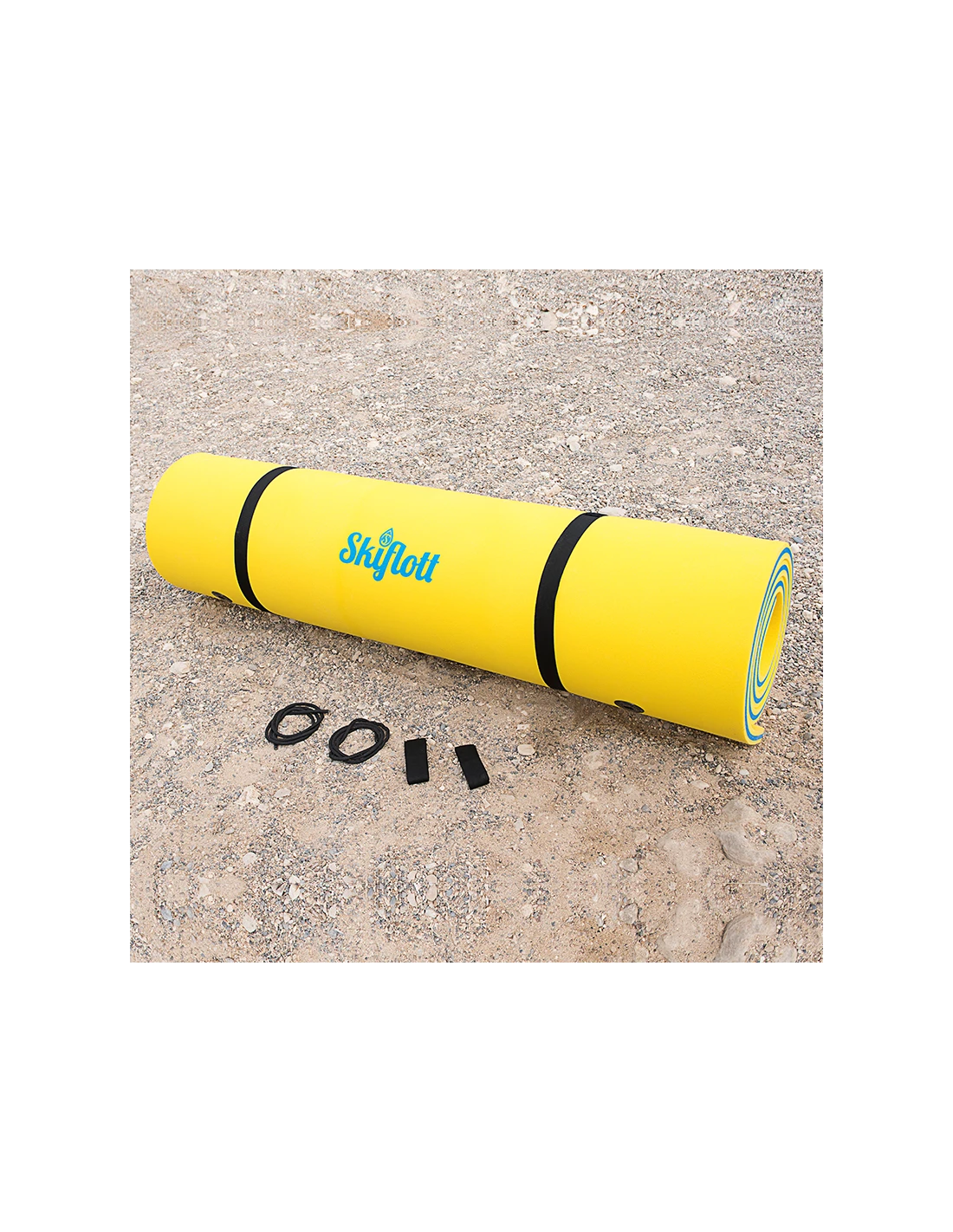 Il est muni de deux sangles pour le maintenir en position enroulé, de velcros pour former des repose-têtes et de quatre points d’ancrage pour l’accrocher à un point fixe ou à un autre tapis Skiflott.