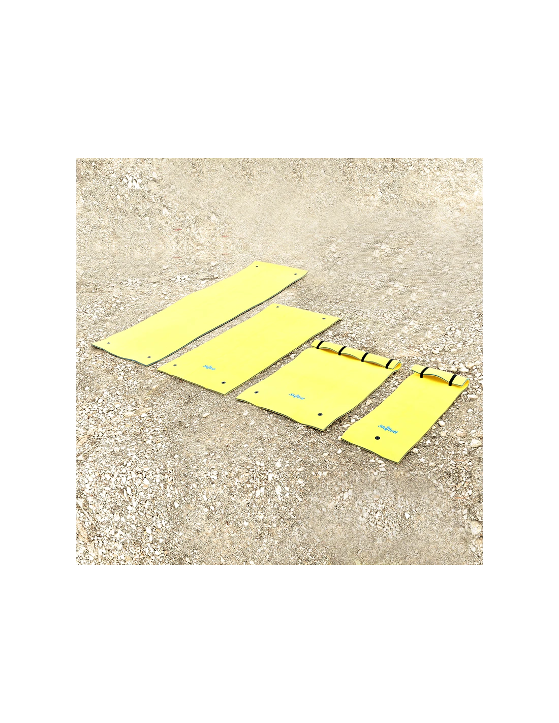 Il est muni de deux sangles pour le maintenir en position enroulé, de velcros pour former des repose-têtes et de quatre points d’ancrage pour l’accrocher à un point fixe ou à un autre tapis Skiflott.
